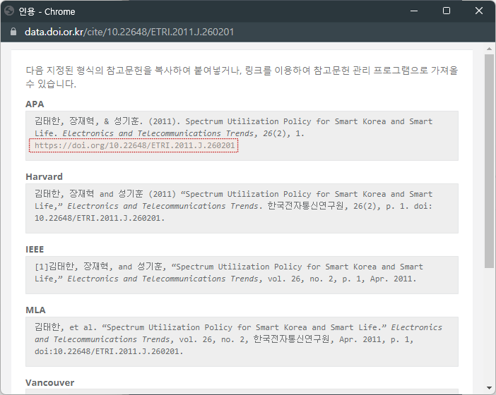 DOI를 이용하면 콘텐츠에 대한 인용이 명확해지고, https://data.doi.or.kr/cite/{DOI} 와 같이 KDC(한국DOI센터)에서 제공하는 편의기능을 이용하여 쉽게 인용문구 생성이 가능합니다.
